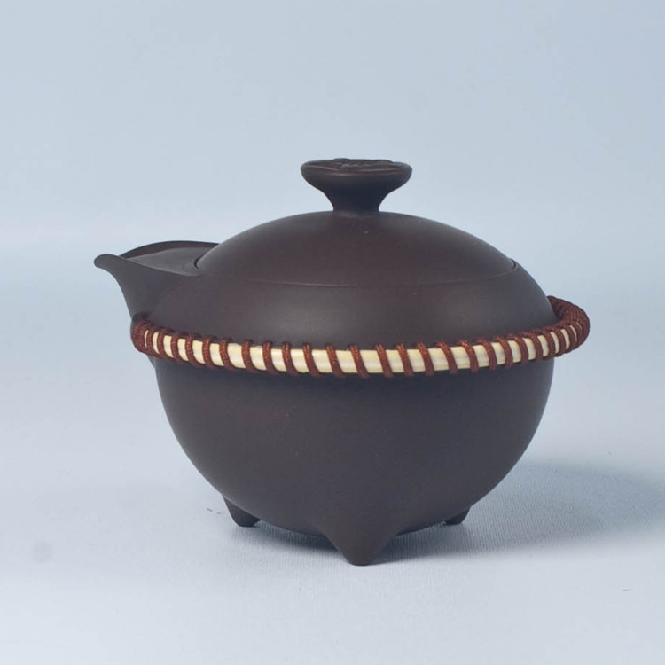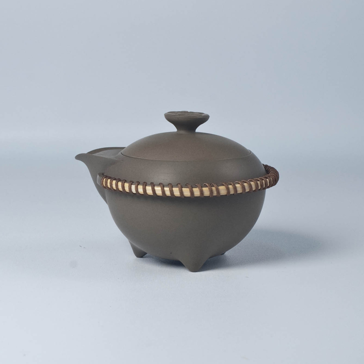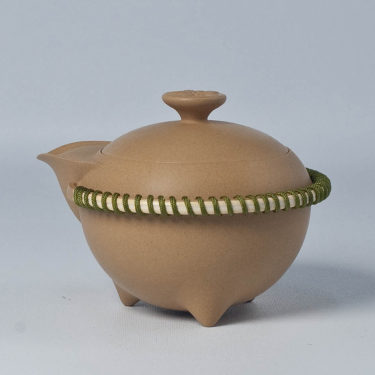 鬆注湯;首創多媒體運用,以陶完成茶壺主體後,在握執處環鑲藤